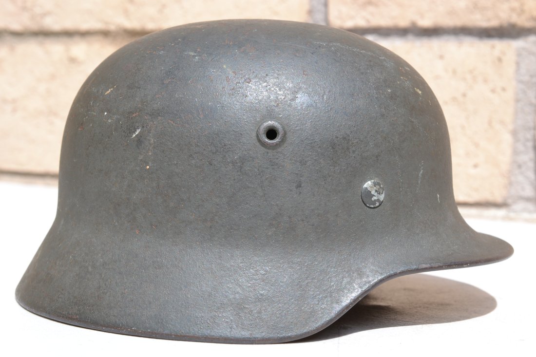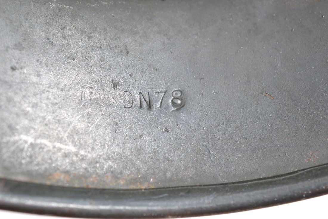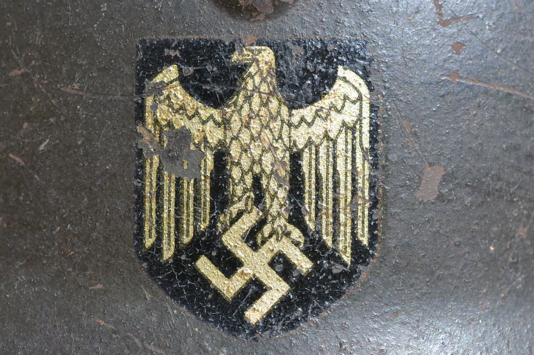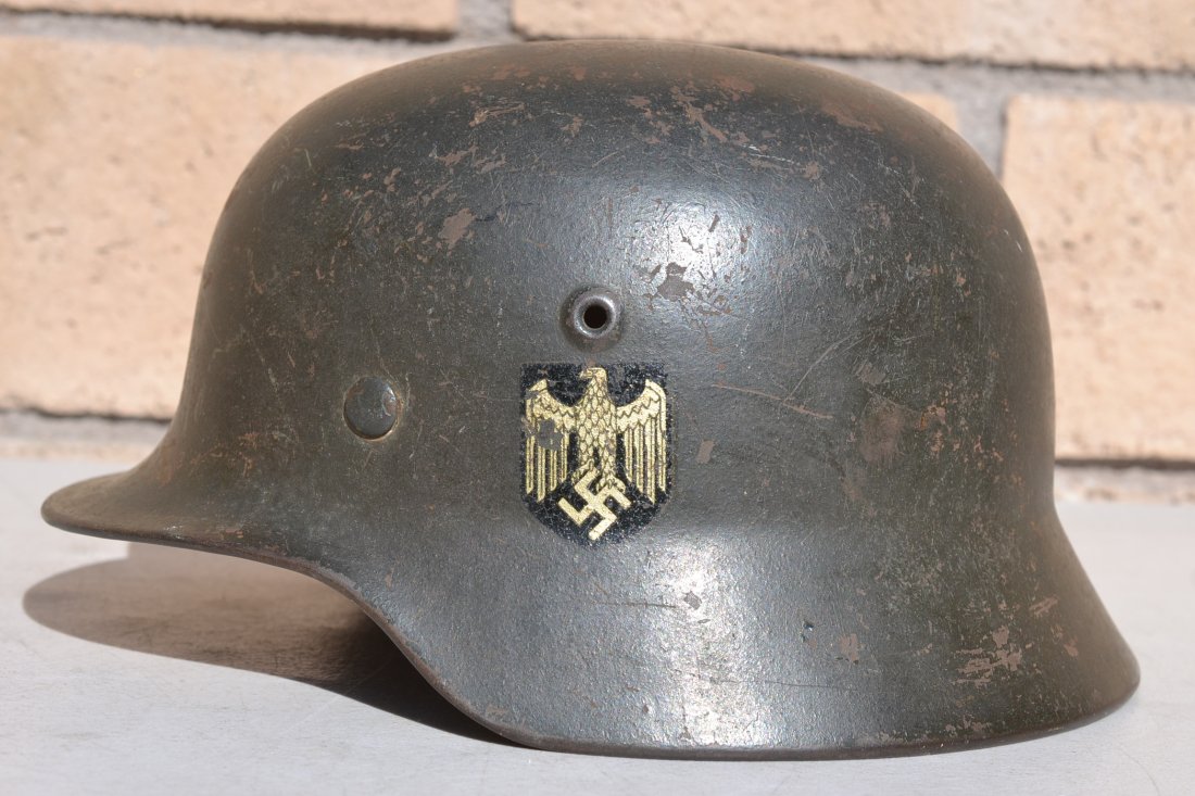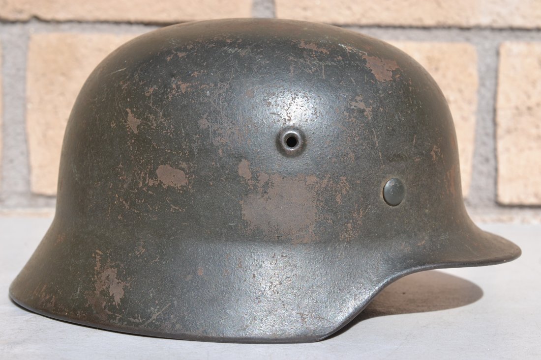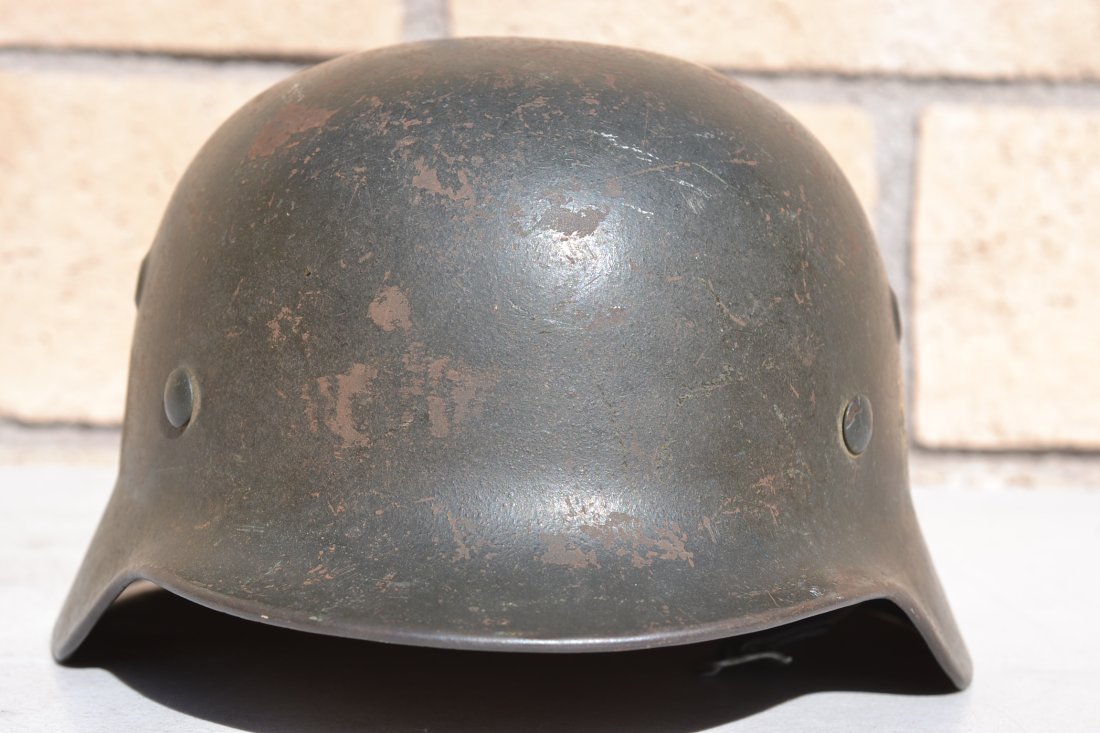 German WW2 M-40 single decal Heer BIG size SE.66. Liner band is to tight to read any stamps and all washers & pins are like they left the factory. Short chinstrap with aluminum buckle.