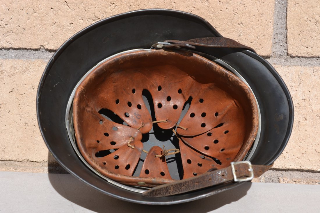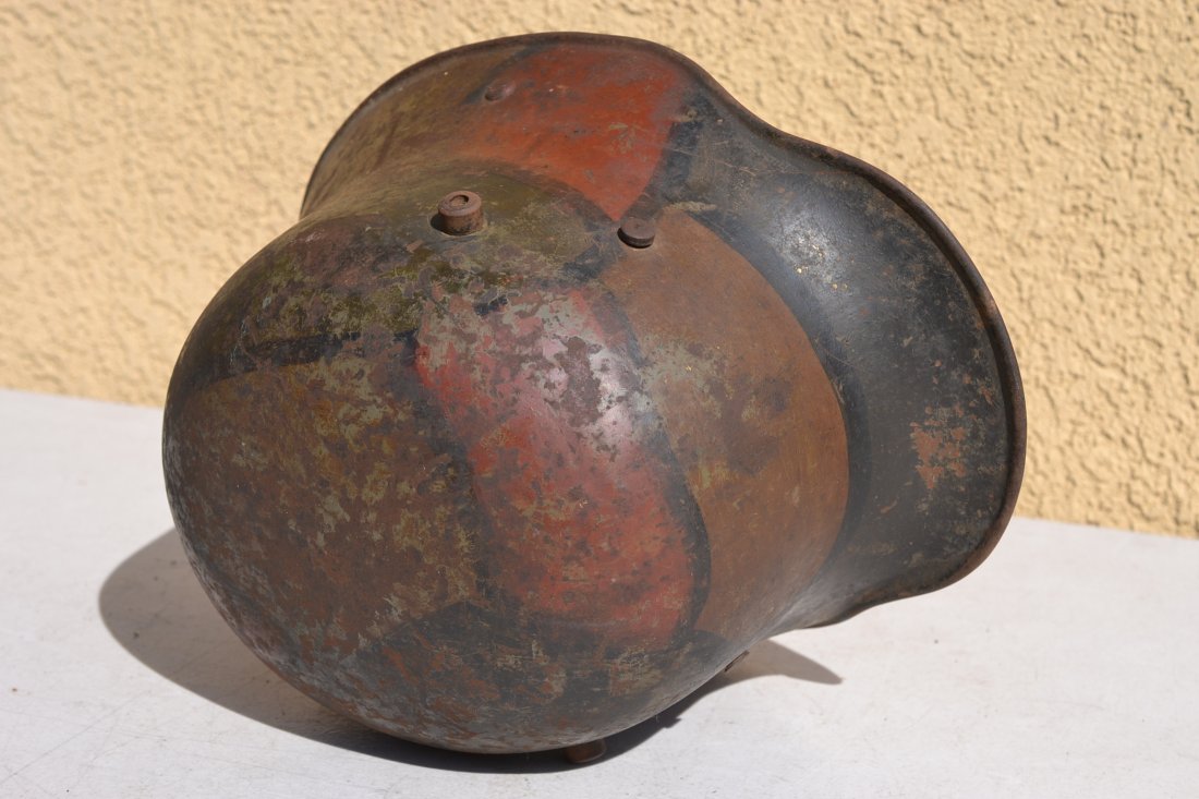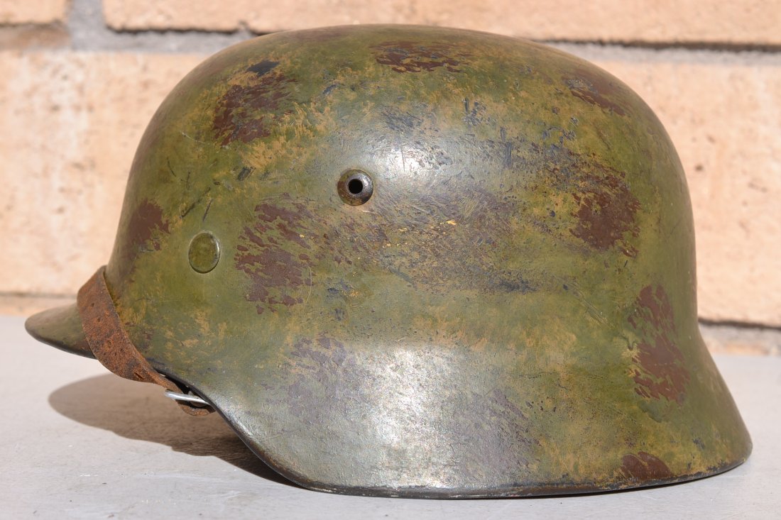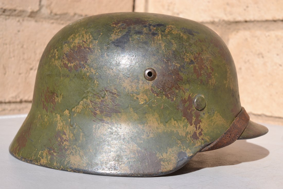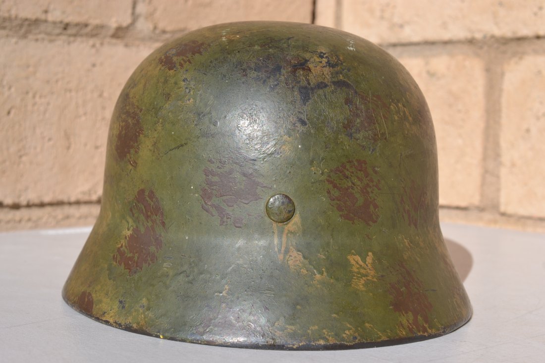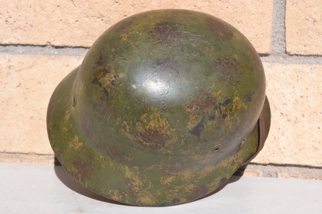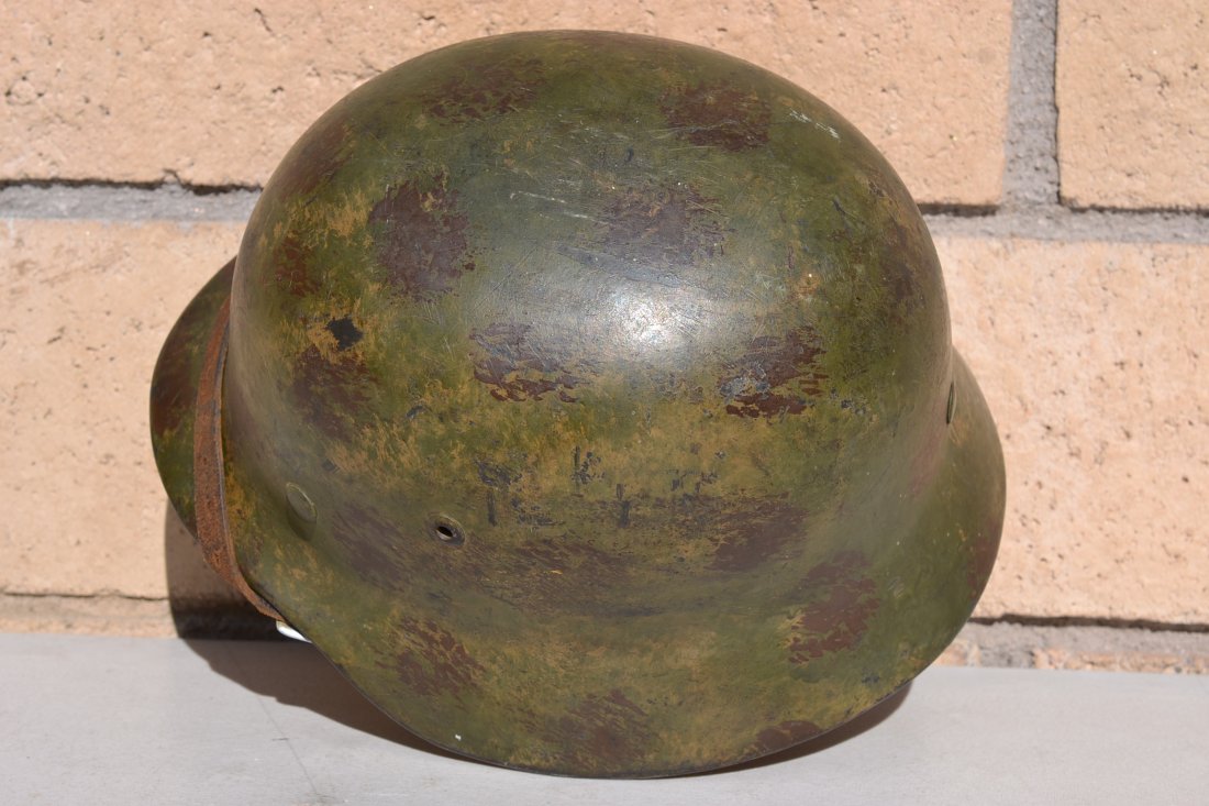 German WW2 M-35 Luftwaffe NS 66 lot # E.171. Beautiful hand painted splotches 3 colors camo with the LW eagle picking through the paint. Liner size 58 with band dated 1939.