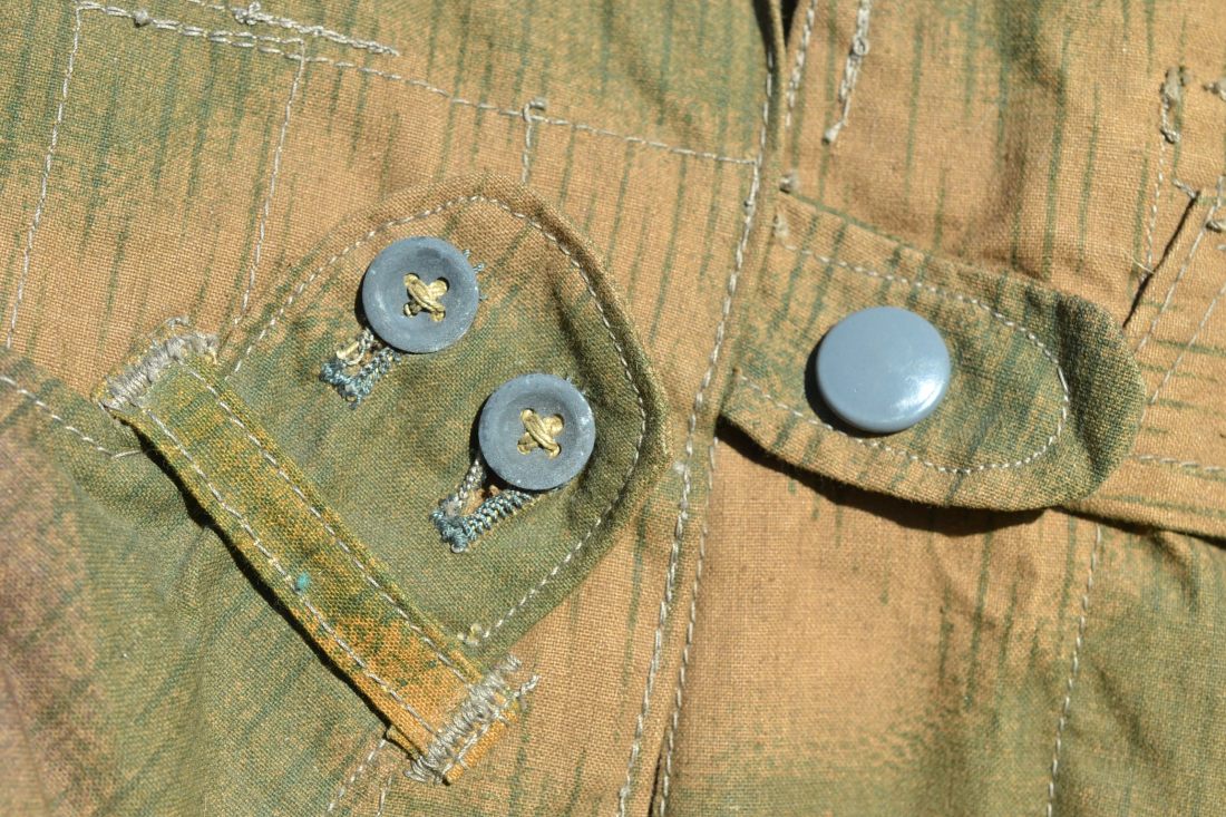 German WW2 Fallschirmjäger Fallschirmschützenbluse paratrooper jump smock splinter pattern camouflage. This is combat used with a great camo LW breast eagle with all the original factory stitching. The lower right pocket zipper is missing the tab, one rip on the left arm about 2 inches long. Rapid maker stamp on the zippers tab. This is the heavy cotton para jacket not the lightweight. Would look great next to a nice FJ Normandy camo M38 paratrooper helmet.