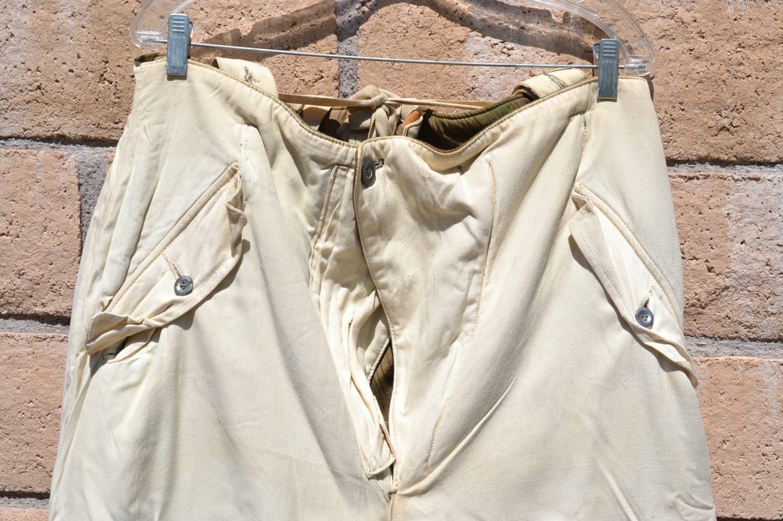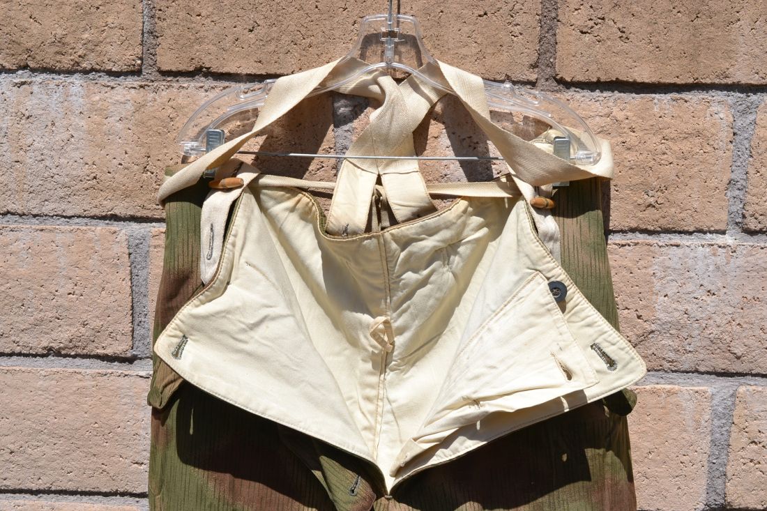 German WWII original used heer – Waffen SS M44 combat trousers ” Keilhose ” All buttons are original to the pants never replaced. Great late war example of combat pants.