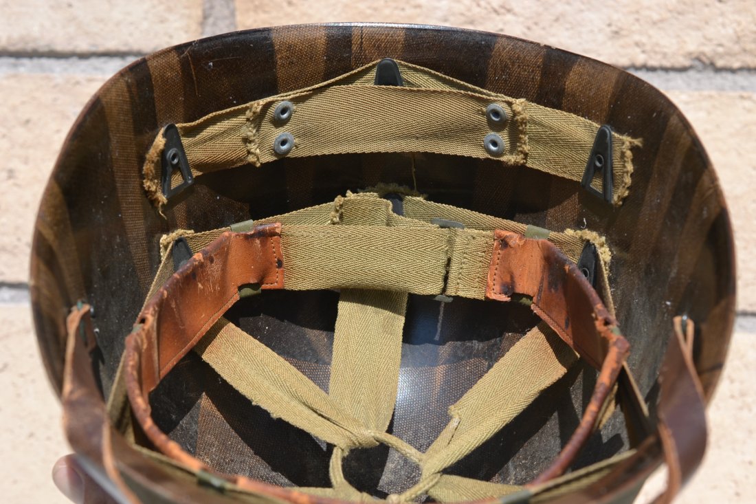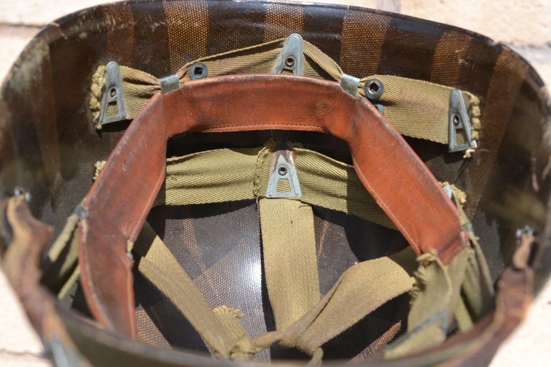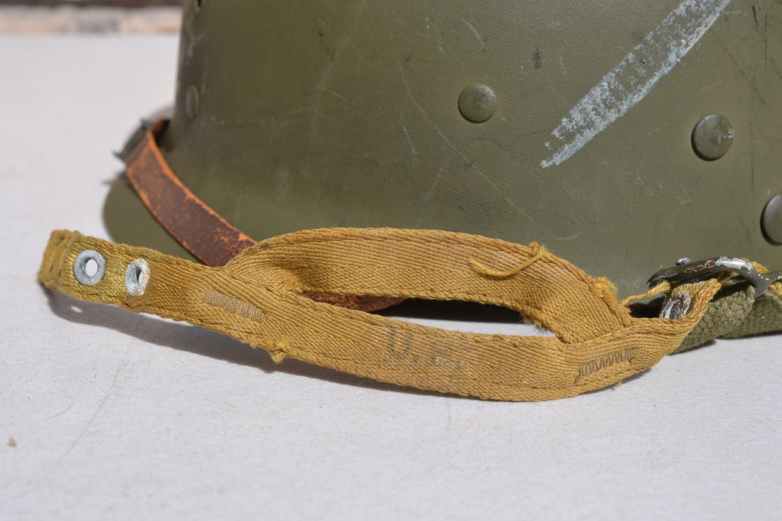 Helmet shell Lot.# 197A (October 1944) and liner complete with the original green buckle leather chinstrap. Great untouched example of American GI WWII combat helmet.