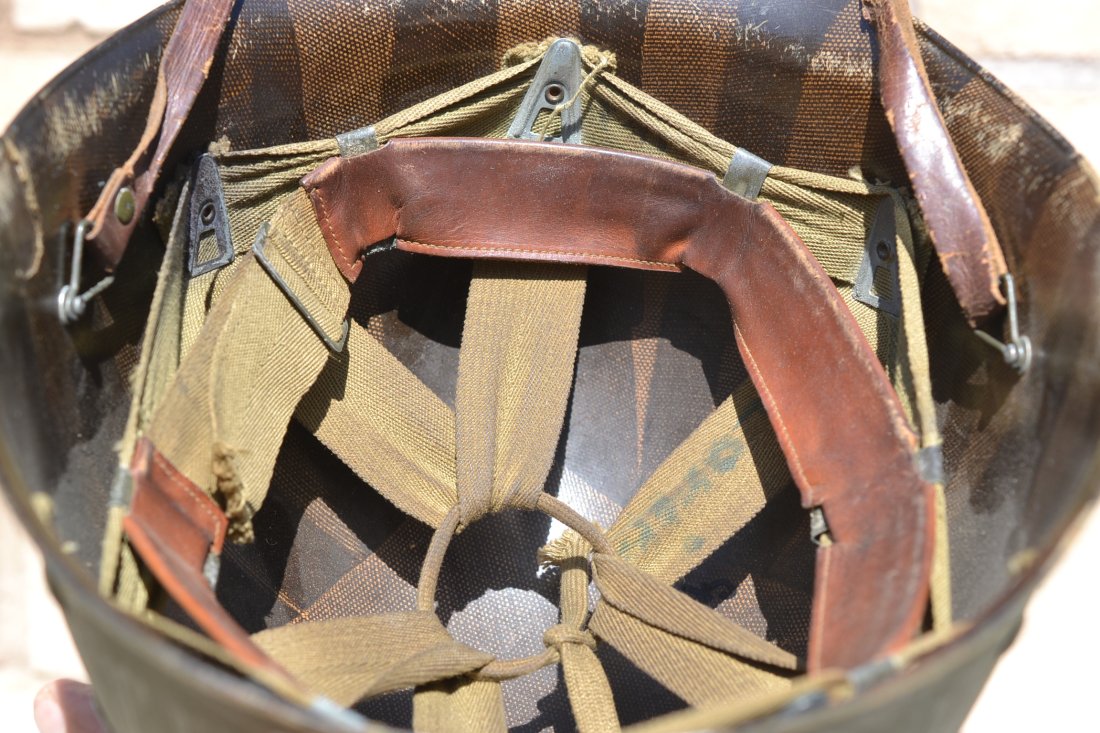 Original WW2 U.S. M-1 helmet front seam fixed bale with CAPAC liner complete with green buckle leather chinstrap. Shell early lot.# stamp 38A 1. Both shell and liner are in excellent conditions with all the original factory issued paint.