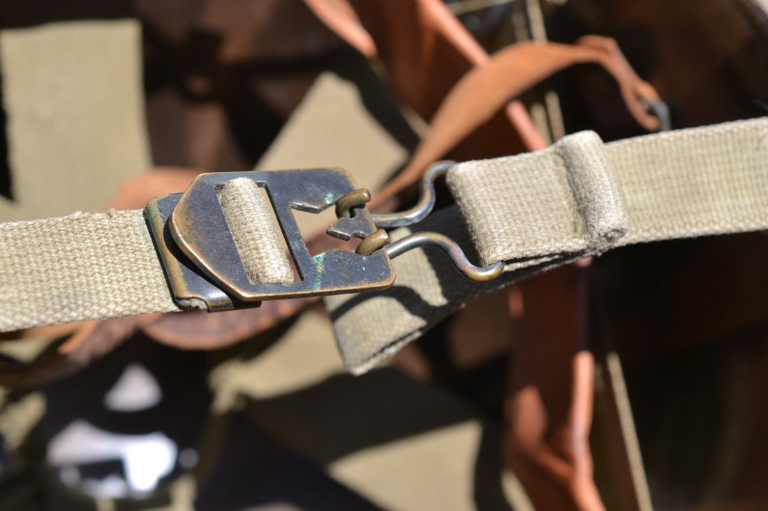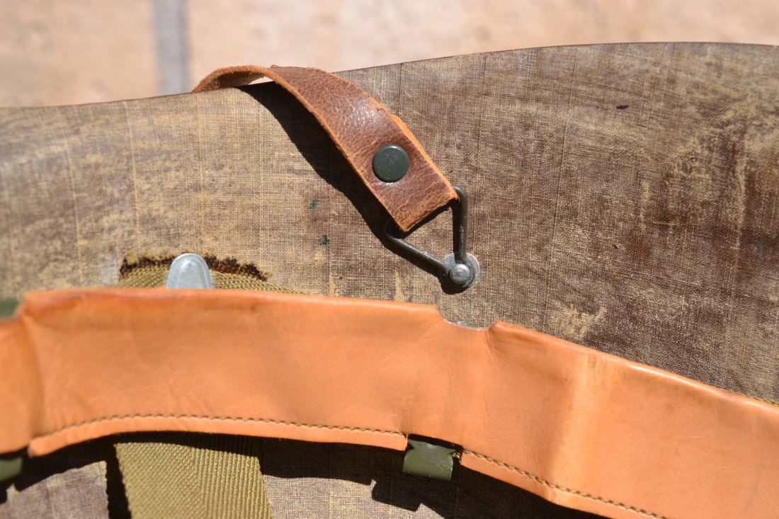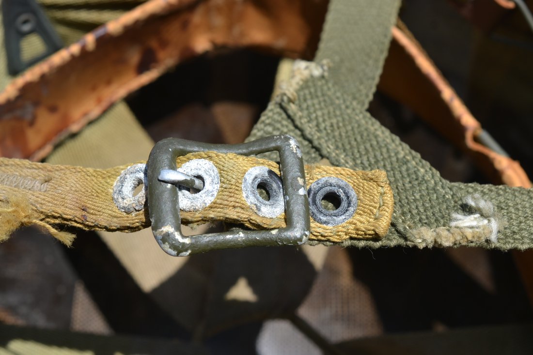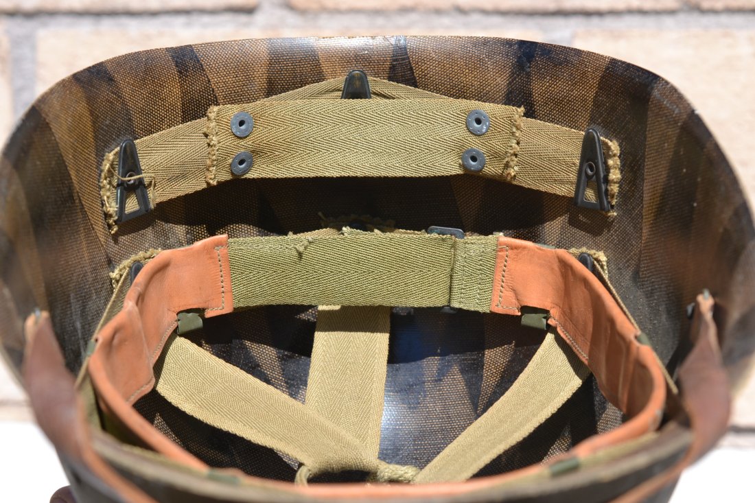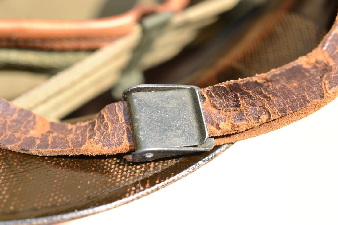 US WW2 M-1 helmet paratrooper liner Westinghouse. Rare and all original WWII vintage complete with the green buckle leather chinstrap and the tan WW2 vintage chin cup. Perfect to complete you M-2 D-bale or M.1-C Airborne helmet.