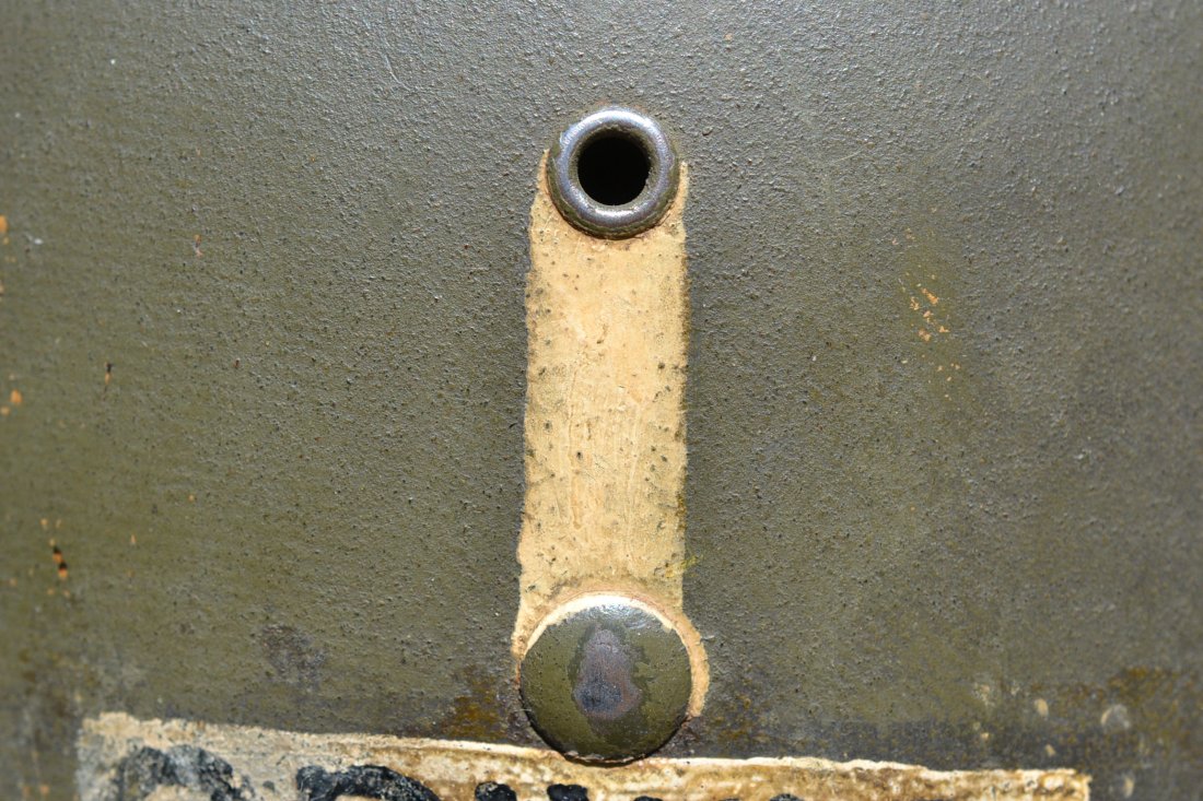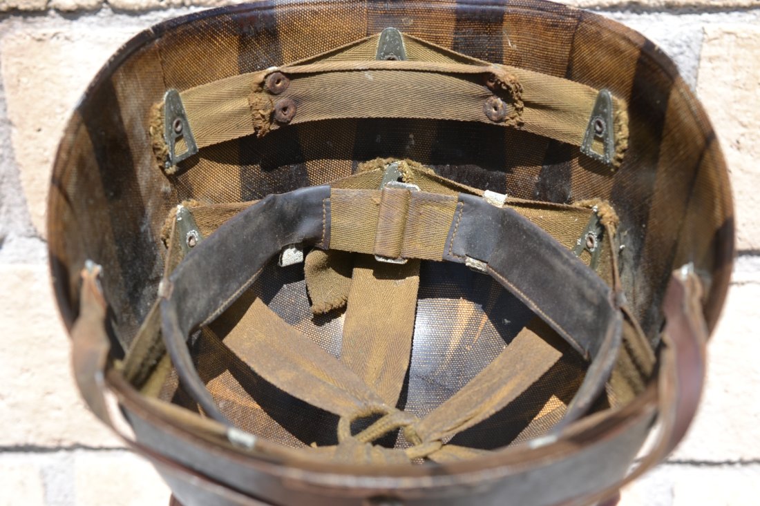 Original WW2 U.S. M-1 helmet front seam fixed bale and Firestone liner. Helmet and liner have a lieutenant rank painted and the liner also the name of the officer. The liner is complete with the early green buckle leather chinstrap. A great looking combat helmet is used matching conditions with a lot of character.