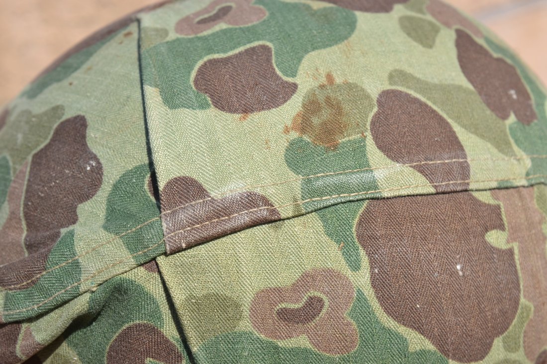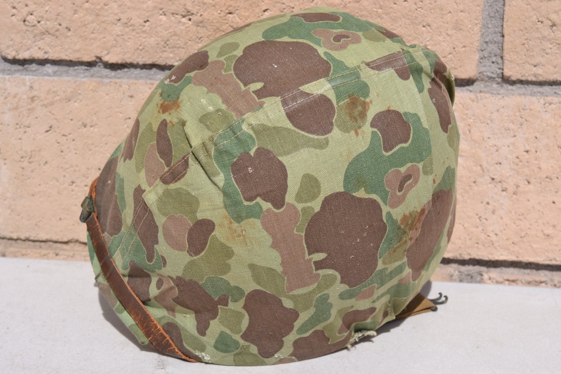 Shell Lot.# 51B 2 and liner Seaman paper company complete with a United Carr green buckle chinstrap. Both shell and liner have all the original factory applied green camo paint. The camouflage cover has NO EGA or any other stamps and shows wear consistent with the rest of the helmet. A very nice example of USMC PTO pacific theater used helmet. $950 (on hold)